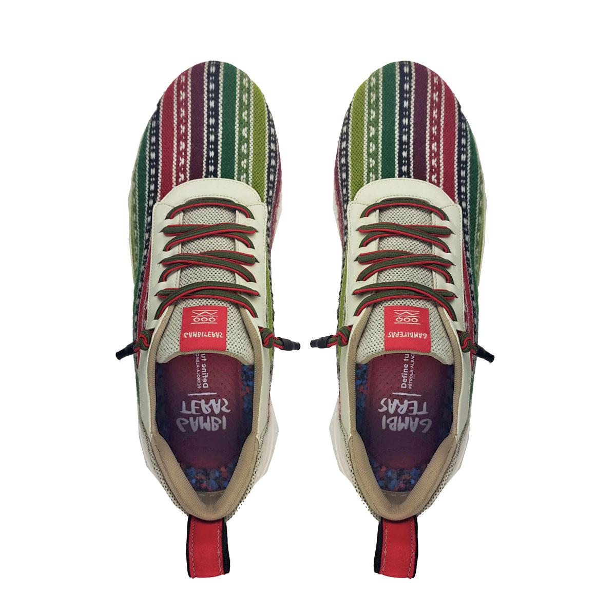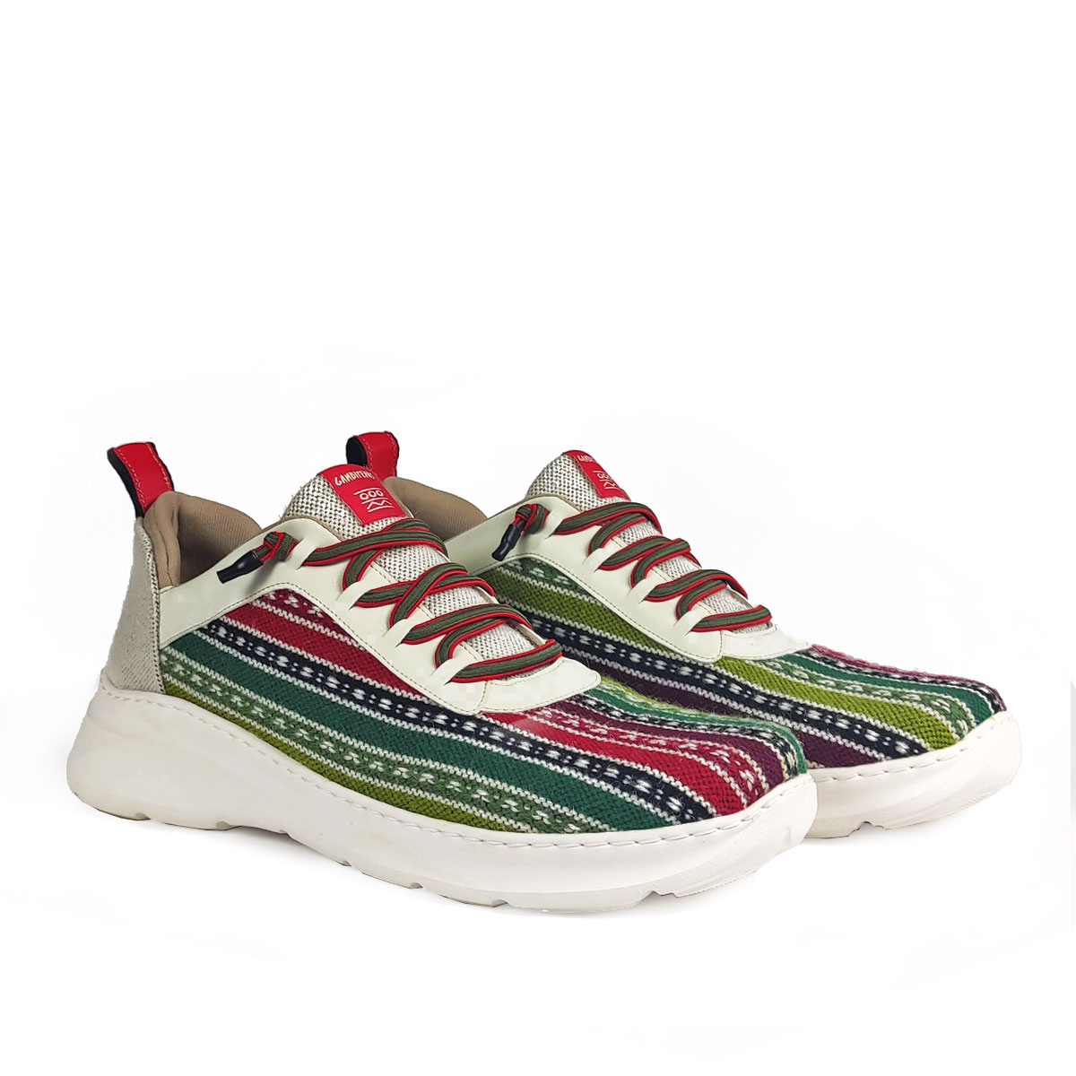 Diseñadas en La Mancha y tejidas con historia, estas zapatillas combinan piel de alta calidad con lana merina 100% natural, hilada artesanalmente. Su colorido tejido refleja el alma de lo auténtico, inspirándose en patrones tradicionales reinterpretados con un enfoque urbano.