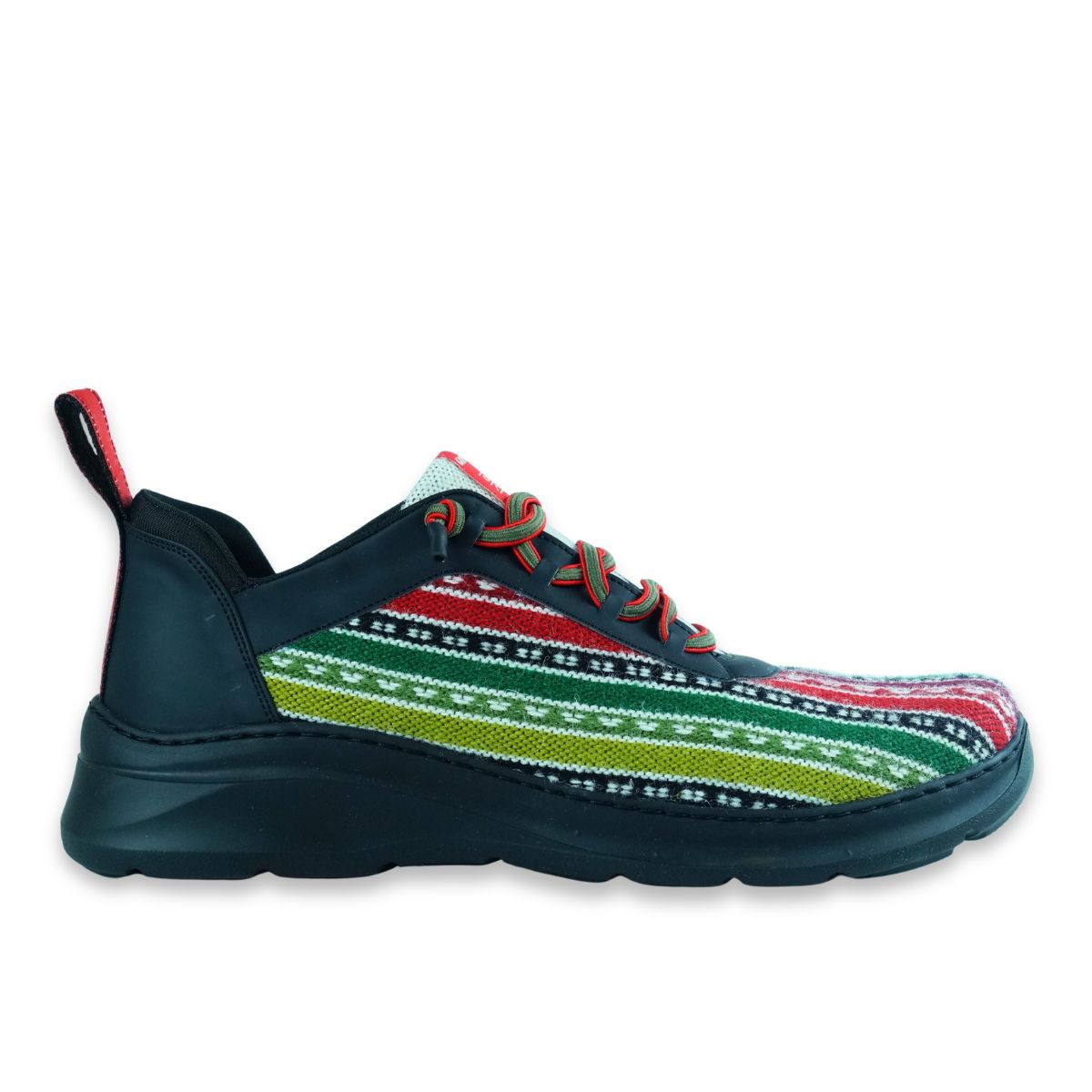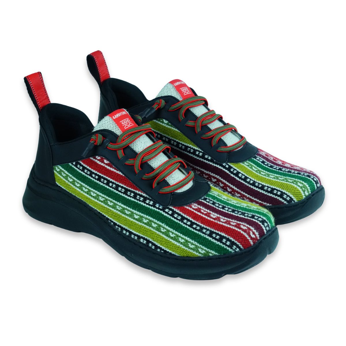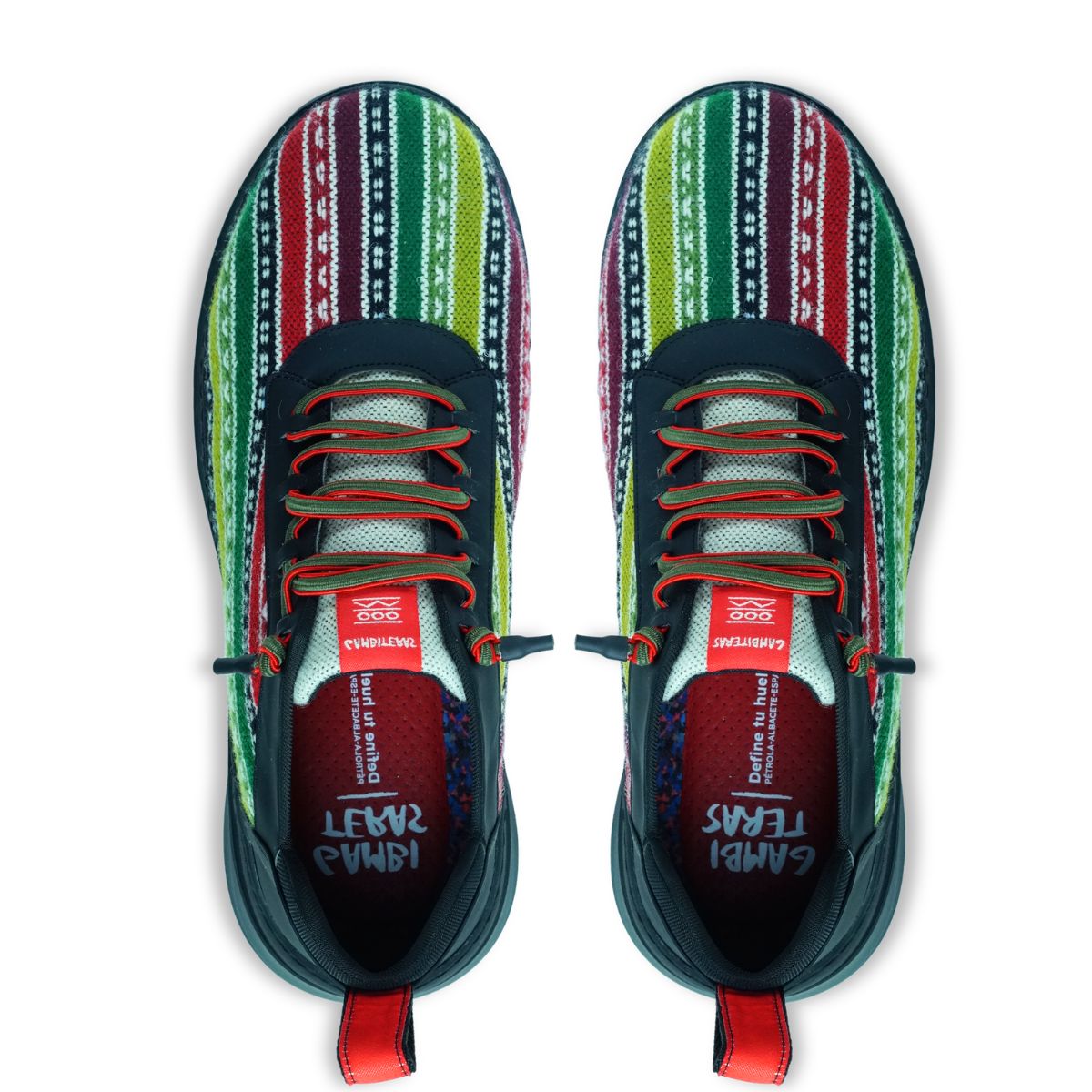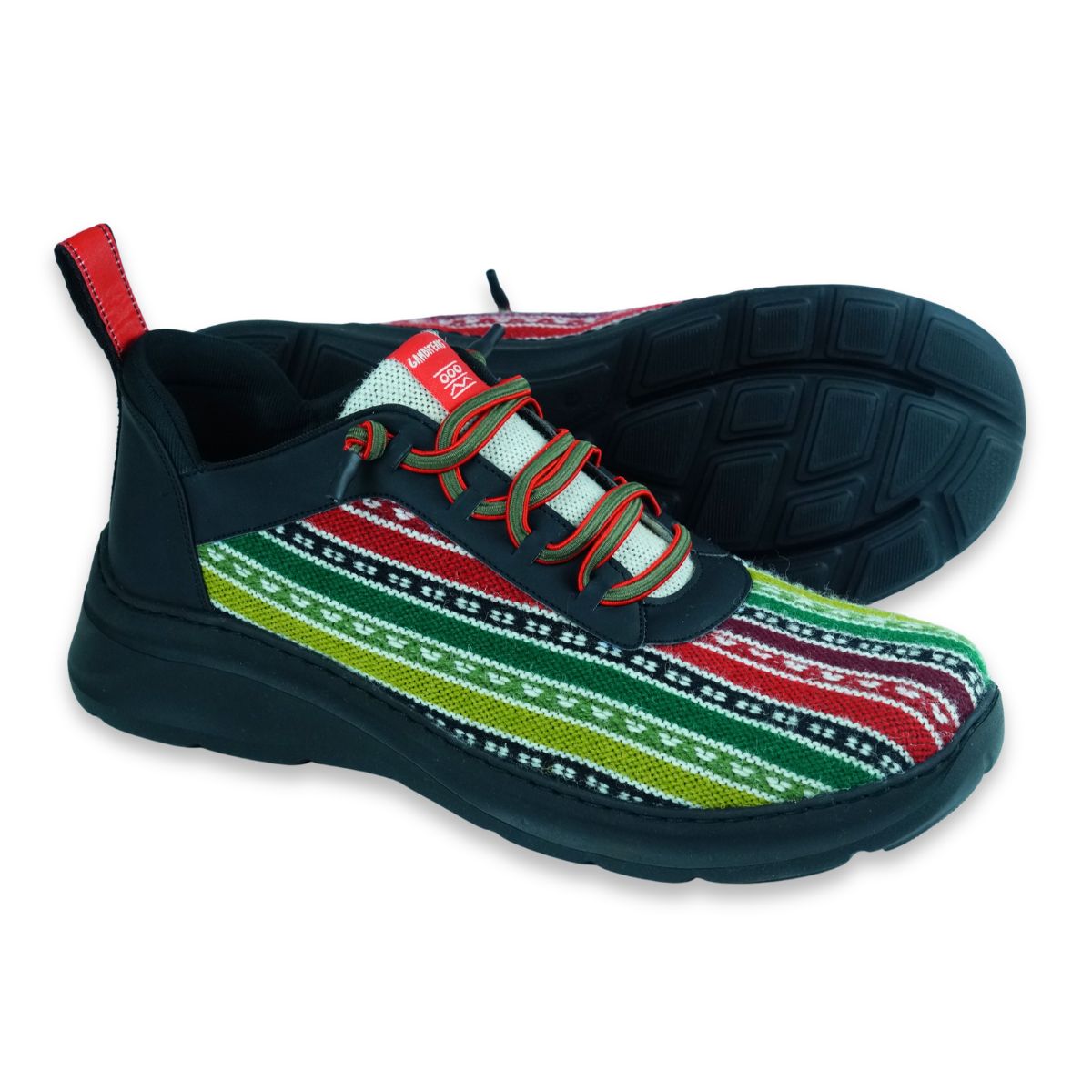 Diseñadas en La Mancha y tejidas con historia, estas zapatillas combinan piel de alta calidad con lana merina 100% natural, hilada artesanalmente. Su colorido tejido refleja el alma de lo auténtico, inspirándose en patrones tradicionales reinterpretados con un enfoque urbano.